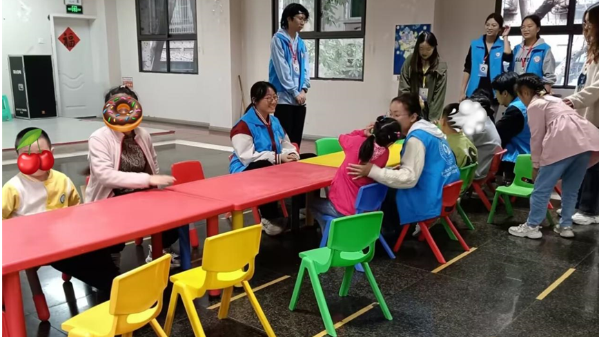 活动伊始,干事正耐心地引导小朋友们唱《数鸭子》。“门前大桥下,游过一群鸭”,音乐响起,志愿者们轻轻拉起小朋友的手,打着节拍。整个房间都被这温暖的歌声填满,传递着爱与希望。